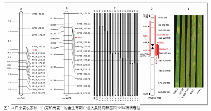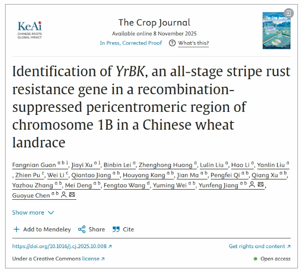 近日,四川农业大学小麦研究所魏育明教授团队陈国跃&蒋云峰研究组在线发表了题为“Identification of YrBK, an all-stage stripe rust resistance gene in a recombination-suppressed pericentromeric region of chromosome 1B in a Chinese wheat landrace”的研究论文。该研究以源自湖南洞口的小麦农家种“白壳和尚麦”为材料,发现其对当前流行条锈菌小种表现出稳定的全生育期抗性,并解析了其抗病遗传基础。