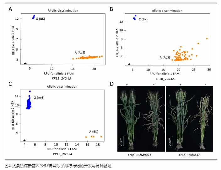 研究团队通过构建“白壳和尚麦”与感病品种Avocet S的重组自交系群体,结合混池的外显子捕获测序技术,发现该农家种条锈病抗性由两个基因共同控制:一个为主效全生育期抗病基因YrBK,另一个为已知的成株抗性基因Yr18。多环境表型鉴定发现,YrBK与Yr18分别贡献12.47%~30.32%和9.74%~20.56%的表型变异,且二者具有显著的加性抗病遗传效应。为进一步精细定位YrBK,团队利用一个包含4474个单株的次级作图群体成功将YrBK锁定在1B染色体臂一个仅0.181 cM的遗传区间内。然而,该区间靠近着丝粒区域,对应一个约56 Mb的物理区域,存在严重的重组抑制现象,增加了图位克隆的难度。值得关注的是,通过整合遗传定位与条锈菌多小种苗期抗谱反应特征分析,研究确认YrBK不同于该区域已报道的其他条锈病抗性基因,是一个尚未被现代育种利用的新基因。为推进该基因的育种利用,团队开发了与该基因共分离的KASP分子标记,并在不同遗传背景材料中验证了其高效性和稳定性。该研究不仅为小麦抗条锈病育种提供了可用的新基因源和分子辅助选择标记,也为下一步YrBK的克隆与功能解析奠定了坚实基础。
