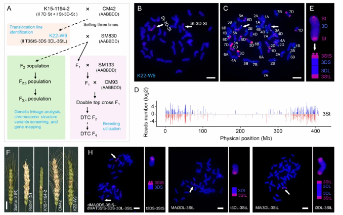 研究团队前期利用高抗赤霉病的小麦-偃麦草部分双二倍体P1142-1-2与普通小麦杂交,创制了抗赤霉病的易位系K15-1194-2。该材料携带7D·St和St-3D-St两种易位染色体,其中7D·St易位已被鉴定为T7DS·7StL,是主效的赤霉病抗源。该研究在K15-1194-2/川麦42的F3:4群体中鉴定到St-3D-St易位系K22-W9,其在两年的温室和田间赤霉病抗性评价中均表现出稳定抗性。液相芯片和细胞遗传学分析表明St-3D-St易位为T3StS-3DS·3DL-3StL。随后基于基因组简化测序数据开发了41个3St特异的分子标记,并构建一个覆盖3StS和3StL片段的物理图谱。在F2和F2:3群体中的遗传效应分析表明,T3StS-3DS·3DL-3StL与赤霉病抗性连锁。进一步通过群体筛选获得3StS与3StL片段分离的染色体结构变异体,其中3DL-3StL端体/等臂染色体系均表现为高感赤霉病,而3DS-3StS端体系表现为高抗赤霉病,说明抗性位点位于3St染色体短臂片段。通过分子标记分析,进一步将该抗性位点定位到对应3St参考基因组0~94.19Mb区间,初步命名为Fhb.Er-3StS。随后利用双顶交-两段选择育种技术获得127份携带Fhb.Er-3StS且农艺性状优良的小麦育种中间材料。