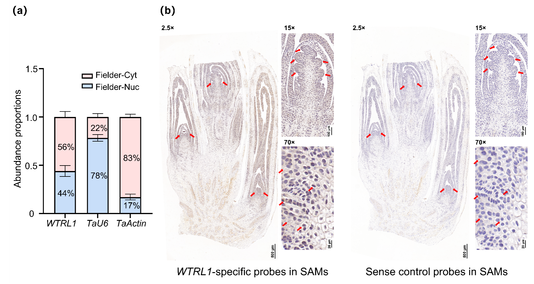 Fielder多时期、多组织RT-qPCR分析和RNA荧光原位杂交(FISH)结果显示,WTRL1在细胞核和细胞质中均有分布,且富集于小麦的茎端分生组织和腋芽分生组织中,暗示其可能参与分蘖芽的萌发与伸长过程(图2)。