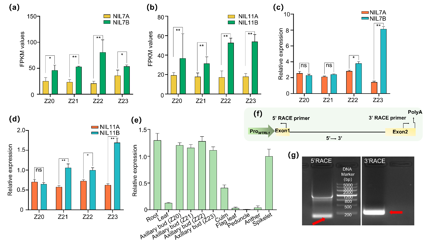 研究团队基于前期构建和发表的小麦分蘖节lncRNA数据库(Zhouetal., 2020),在分蘖近等基因系NIL7和NIL11中,鉴定并筛选到了一个在寡分蘖小麦中显著高表达的lncRNA,将其命名为WTRL1(Wheat Tiller RelatedLong noncoding RNA 1)。RACE PCR获悉,WTRL1全长为762bp(图1)。