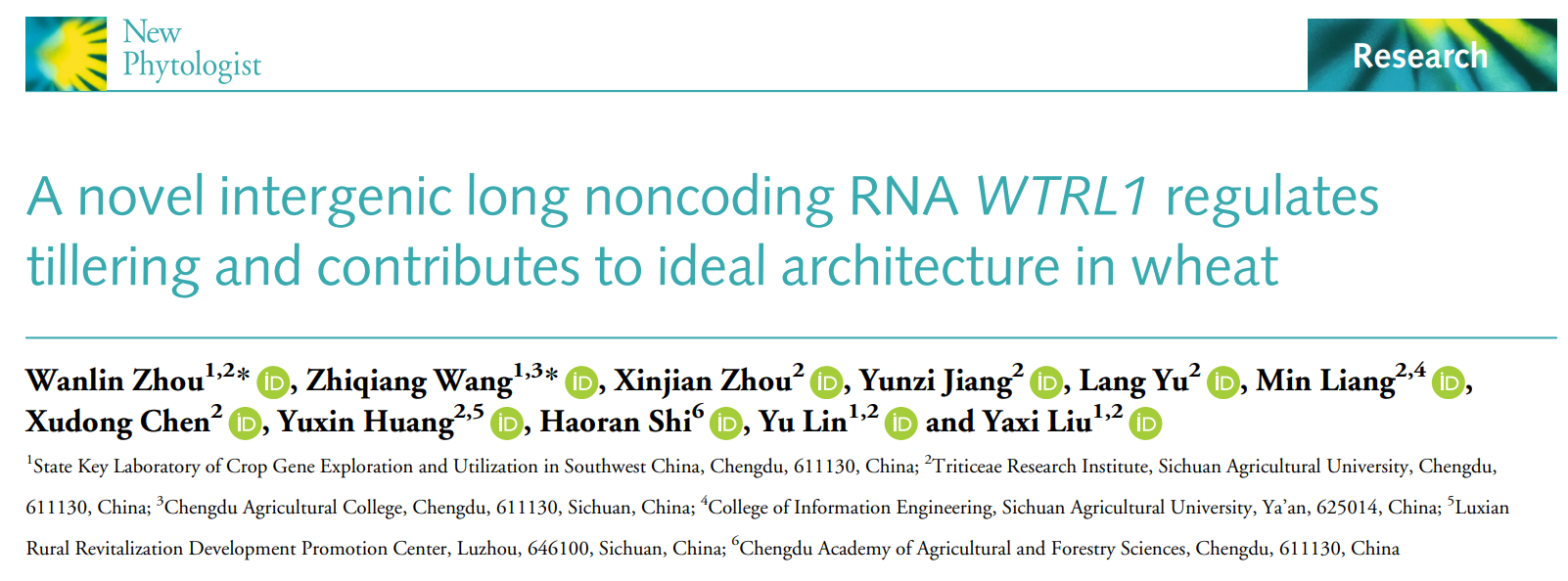 近日,四川农业大学刘亚西教授团队在植物学领域国际权威经典期刊New Phytologist上发表了题为《A novel intergenic long non-coding RNAWTRL1regulates tillering and contributes to ideal architecture inwheat》的研究论文。该研究首次在普通小麦中鉴定并功能验证了一个位于基因间区的长链非编码RNA(lincRNA)——WTRL1,该lncRNA能够负调控分蘖数、促进早花,并影响小麦的株高和穗长,为小麦理想株型育种工作提供了新的转录后调控分子工具。