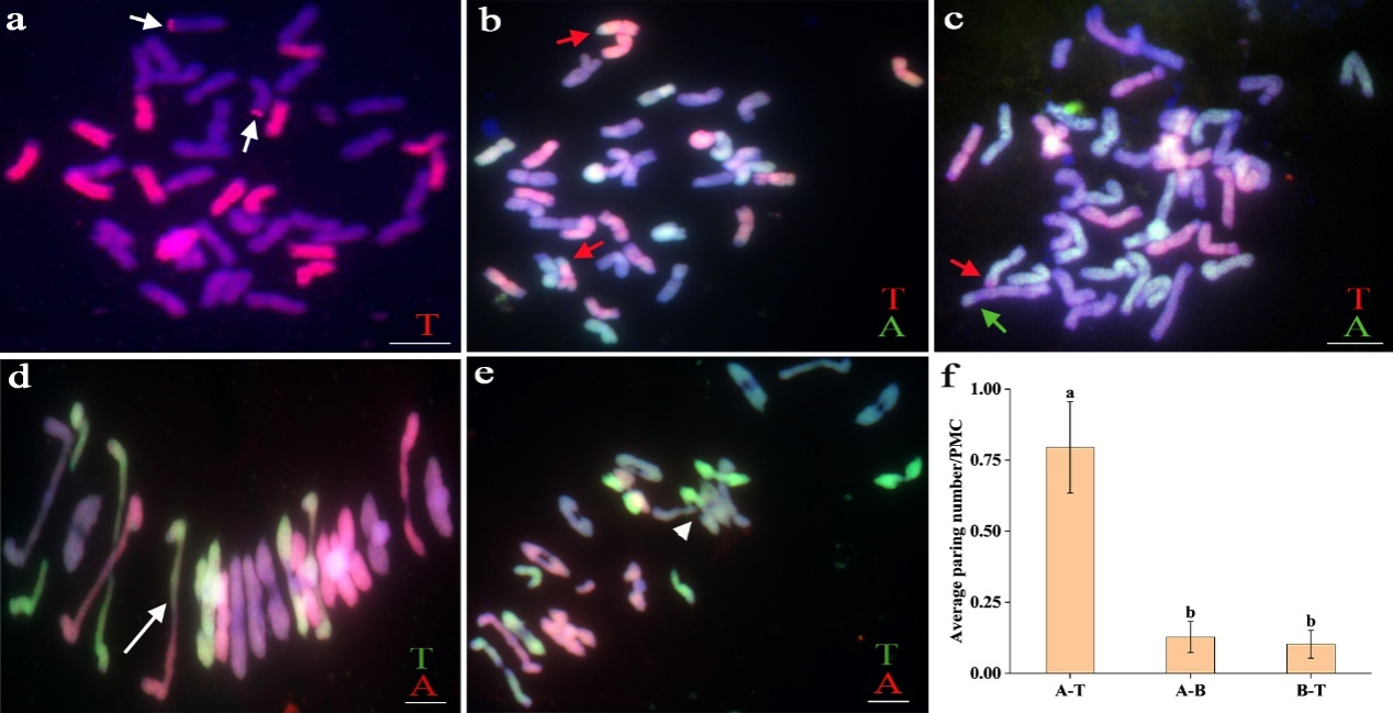 在四倍体硬粒小麦Langdon与无芒山羊草杂交创制的双二倍体(AABBTT)中,对9粒S1种子进行GISH鉴定发现3粒携带易位染色体(图2a)。从S1选取染色体组成正常且无易位染色体的植株自交获得S2种子,9粒种子中再次鉴定出3粒含易位染色体(图2b, c)。减数分裂GISH分析进一步证实了AABBTT存在非同源染色体配对现象(图2d, e),且A-T配对频率最高(图2f),与单倍体结果一致。