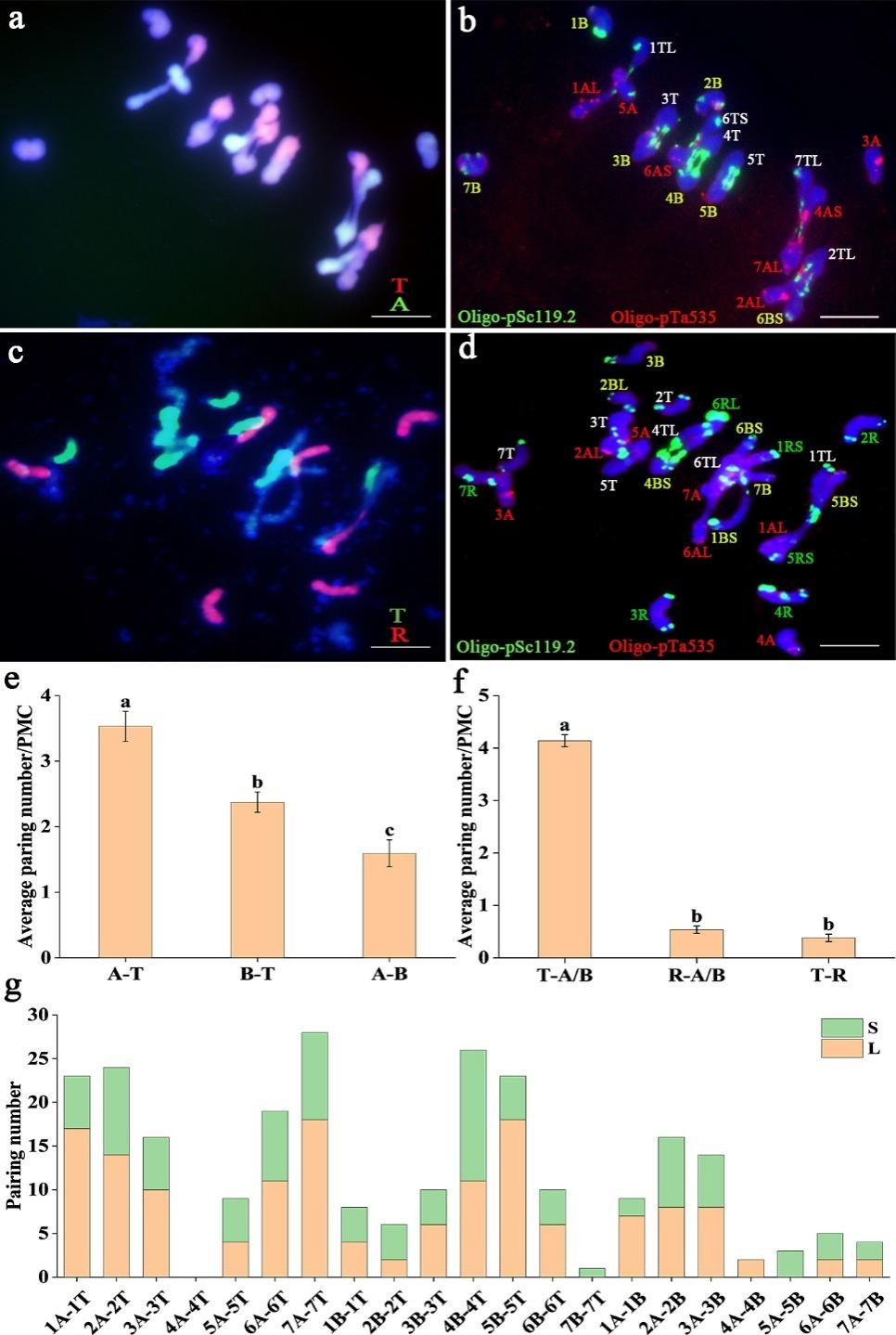 该研究首先构建了五种不同基因组背景的遗传材料(ABT、ABTR、AABBTT、AABBDDTT和AABBDT),所有材料均含有Ph1基因。通过细胞学分析发现,在ABT单倍体背景下,减数分裂中期染色体配对以部分同源配对为主,其中A-T配对频率最高(图1a, b, e)。染色体臂配对统计显示,除4A-4T外,其余染色体均观察到了部分同源配对(图1g)。在ABTR单倍体中也观察到类似现象,但R基因组参与配对较少,T与A/B基因组配对频率最高(图1c, d, f)。结果表明,部分同源配对频率与基因组亲缘关系呈正相关。