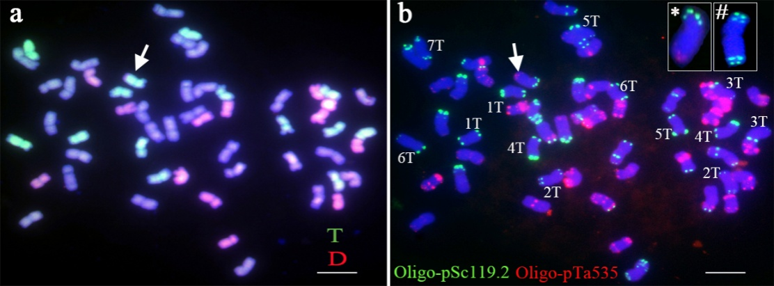 利用普通小麦中国春与无芒山羊草杂交创制的双二倍体(AABBDDTT)中,27粒S1种子仅发现1粒存在易位(图3),易位频率明显低于AABBTT背景。此外,通过普通小麦新中长与Langdon-无芒山羊草双二倍体杂交获得AABBDT材料,其D/T基因组以单倍体形式存在。GISH分析显示存在大量D-T配对(平均每细胞1.39对),同时也存在少数非T-D配对(图4a-c)。尤为显著的是,在AABBDT自交F2代,仅经历一次减数分裂,单粒种子竟鉴定出12个易位染色体,包括1个A/B-T-D三染色体易位(图4d,双箭头)和2个插入易位(图4d,长箭头)。