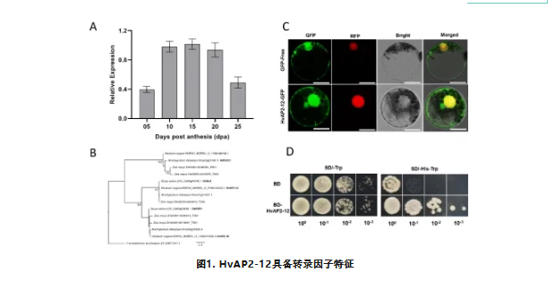 对AP2/ERF转录因子家族进行了全基因组分析,利用已发表的转录组数据,我们筛选出数个在籽粒发育期高表达的AP2/ERF基因。HvAP2-12的表达量在籽粒发育早期(5天)较低,中期(10-20天)达到峰值,后期(25天)逐渐下降(图1A)。氨基酸结构图显示HvAP2-12包含两个AP2/ERF结构域。该基因作为水稻OsGL6的大麦同源基因,可促进水稻叶片毛状体的形成(图1B),但OsGL6在籽粒中的功能尚未被探索,HvAP2-12可能是未被报道参与籽粒淀粉合成的AP2/ERF家族新成员(图1B)。在本氏烟叶片和小麦原生质体中瞬时表达HvAP2-12与绿色荧光蛋白(GFP)的融合蛋白,分析了该蛋白的亚细胞定位。表明HvAP2-12定位于细胞核和细胞质。酵母在筛选培养基上的生长情况及显色反应证实HvAP2-12具有转录激活活性(图1D)。