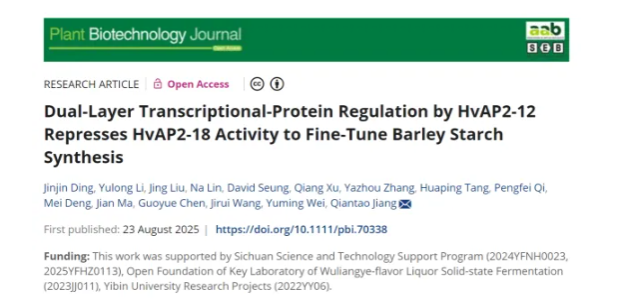 近日,Plant Biotechnology Journal杂志在线发表了由四川农业大学小麦研究所江千涛教授研究组完成的题为“Dual-Layer Transcriptional-Protein Regulation by HvAP2-12 Represses HvAP2-18 Activity to Fine-Tune Barley Starch Synthesis”的论文。该研究鉴定出一个具有典型转录因子特征的APETALA2/乙烯反应因子(AP2/ERF)家族基因HvAP2-12。过表达HvAP2-12不影响总淀粉和直链淀粉含量,而基因编辑突变株系总淀粉含量增加,直链淀粉含量极显著降低。进一步分析发现,HvAP2-12不直接结合主要淀粉合成基因的启动子,但可结合另一个AP2/ERF家族成员HvAP2-18的启动子,并与HvAP2-18蛋白发生相互作用。HvAP2-18同样影响大麦籽粒淀粉合成,其过表达能提高总淀粉含量,同时降低直链淀粉含量。HvAP2-18直接结合关键淀粉合成基因HvAGP-S1和HvSBE1的启动子,激活其表达。此外,HvAP2-12会抑制HvAP2-18对HvAGP-S1和HvSBE1启动子的结合。基于这些发现, HvAP2-12与HvAP2-18在淀粉基因调控及大麦籽粒品质决定中发挥关键作用。
