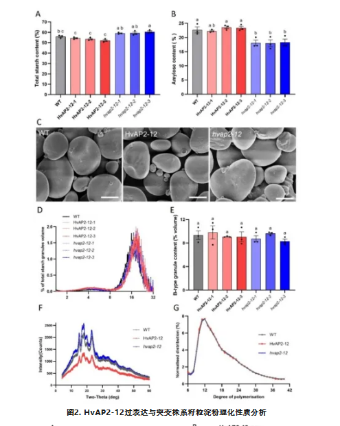 扫描电镜(SEM)分析显示过表达株系、突变体与野生型具有相似的颗粒结构(图2C)。粒径分布表明HvAP2-12不影响淀粉颗粒形态。X射线衍射(XRD)显示HvAP2-12特异性调控淀粉结晶度而不改变晶体类型。采用高效阴离子交换色谱(HPAEC)对DP6至DP42区间的数据进行标准化处理后发现,过表达株系、突变体与野生型对照之间未出现明显的链长分布模式差异(图2G)。HvAP2-12-2过表达株系、hvap2-12-2突变体与野生型株系无显著区别。