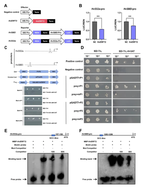 该研究鉴定出AP2结构域转录因子HvERF72作为大麦籽粒淀粉合成与颗粒起始的关键调控因子。通过CRISPR/Cas9技术构建的HvERF72敲除突变体分析表明:B型淀粉颗粒形成增强,总淀粉含量提升;而过表达株系则呈现相反表型,表现为淀粉积累减少及B型颗粒起始受抑。开花后15天(15 DAF)的转录谱分析显示,敲除突变体中关键淀粉合成基因(HvAGPL1、HvAGPS1、HvSS2a、HvSBEI、HvSBEIIb和HvGBSSI)显著上调,而过表达株系中这些基因表达下调。机制研究发现HvERF72直接结合HvSS2a和HvSBEI启动子区的GCC-box基序,抑制其转录活性。该研究确立了HvERF72为同时调控淀粉合成与B型颗粒起始的双重功能调控因子,为大麦育种中优化淀粉产量及工业加工品质提供了新分子靶点。