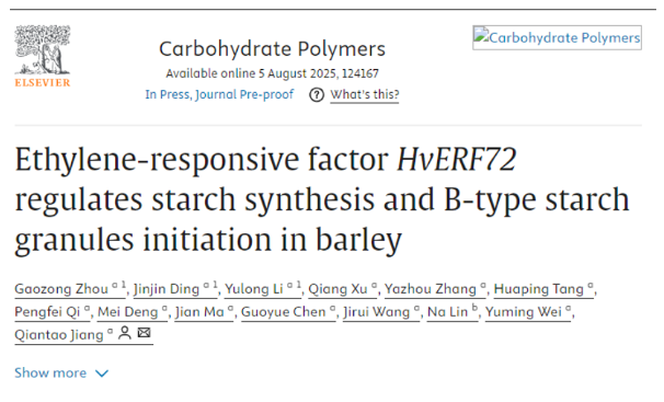 近期,四川农业大学小麦研究所江千涛教授研究组完成的题为“Ethylene-responsive factor HvERF72 regulates starch synthesis and B-type starch granules initiation in barley”的研究论文在《Carbohydrate Polymers》在线发布。该研究发现HvERF72作为关键转录抑制因子,通过GCC-box基序直接靶向HvSS2a和HvSBEI基因,抑制大麦淀粉生物合成与B型淀粉颗粒形成。其抑制作用降低了大麦总淀粉含量,同时提升直链淀粉比例和籽粒蛋白水平,在碳分配过程中发挥关键作用。HvERF72基因敲除可促进B型颗粒生成并改变淀粉热特性,揭示了转录调控与淀粉功能品质性状的关联。作为首个在谷物淀粉代谢中被明确机制的ERF家族抑制因子,揭示了大麦淀粉代谢中一种新的抑制性调控机制,拓展了对转录因子如何控制籽粒品质性状的认知。该研究为未来通过育种或生物技术手段调控HvERF72基因表达,为培育具有优化淀粉组成和颗粒结构的大麦品种以满足工业需求奠定了理论基础。