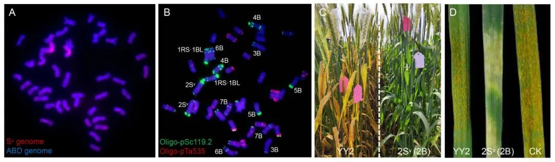 易变山羊草(Aegilops variabilis,2n=4x=28,SvSvUvUv)表现出优异的条锈病抗性。四川农业大学刘登才教授团队前期发现,普通小麦异源2号(高感条锈病)和易变山羊草AS116(高抗条锈病)创制的2Sv(2B)代换系表现出条锈病抗性。小麦与易变山羊草的染色体在减数分裂过程中通常不能配对重组,但是在phKL系统的帮助下能够诱导小麦-易变山羊草染色体配对。
