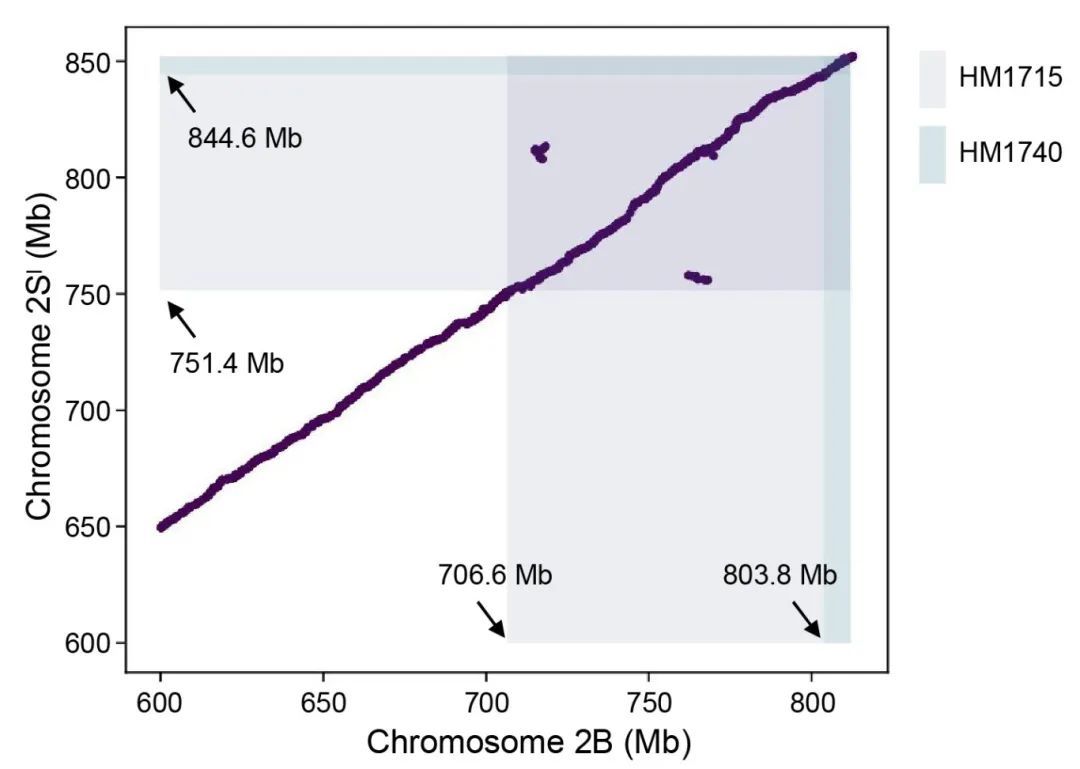 图3两个2Sv-2B易位染色体中缺失片段(2B)与各自导入片段(2Sv)具有良好的共线性